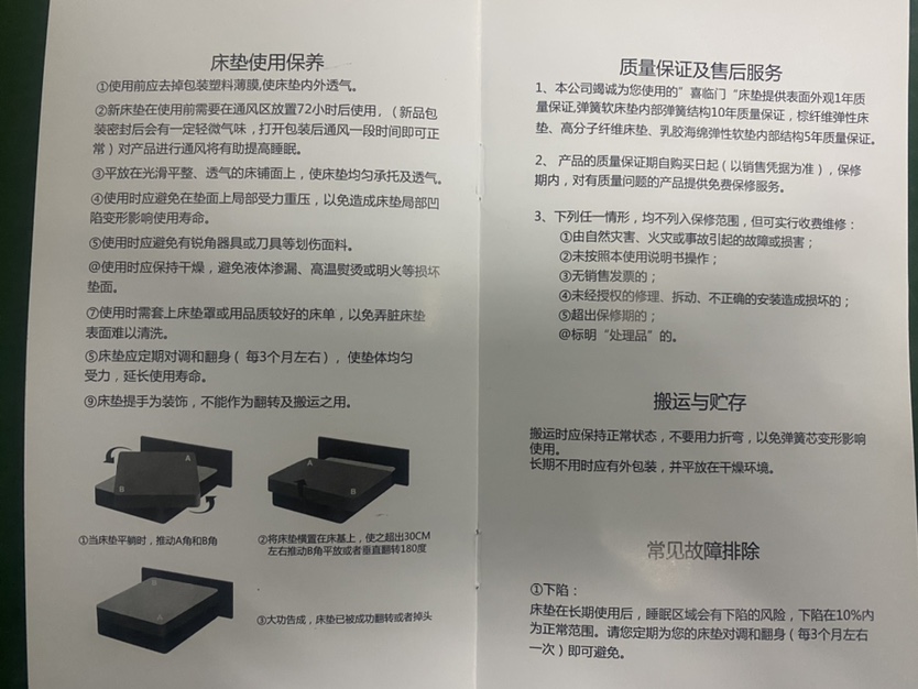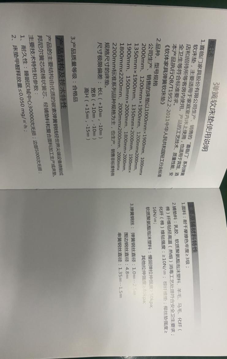 3、查看使用说明。使用说明应包含:a.产品名称、型号规格、执行标准编号,弹簧结构特征;b.产品主要尺寸、使用场所;c.产品主要原、辅材料名称;d.有害物质限量指标;e.产品使用方法、注意事项;f.产品保养方法。